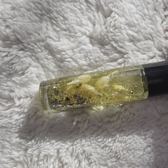 It's Golden Hour with this delicious marshmallow scented lip oil. Wonderful for moisturizing and softening the lips with a bit of flavor, stunning golden glitter and elegant flower pieces! Apply often for sweet soft lips before lipstick, gloss, balm, etc. or just apply for a sweet natural lip.